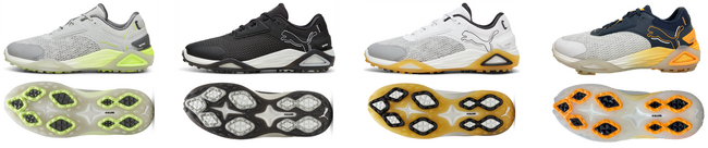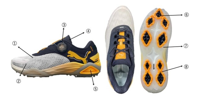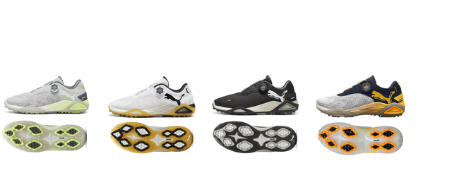 また、アウトソールは PUMA のロゴであるピューマからインスピレーションを受けた猫の目の形をした CAT- EYE TRACTION(キャットアイ トラクション)が特徴的です。スイング時の体重移動を考慮して配置された CAT- EYE TRACTION(キャットアイ トラクション)中心部がより硬度のある樹脂となり、外側は柔軟性のある樹脂を使用することで、強力に地面をグリップします。