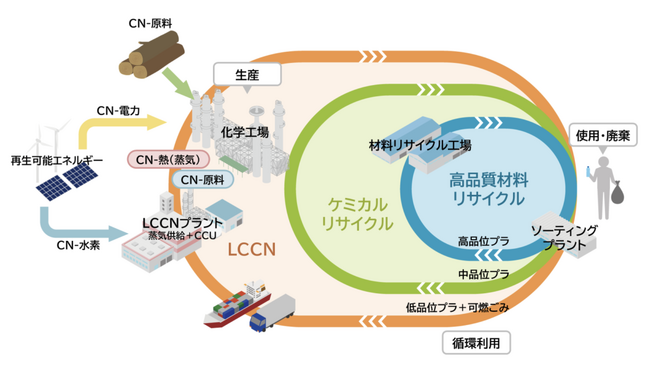 LCCNは、例えば再生可能エネルギーを利用して水(H2O)を酸素(O2)と水素(H2)に分解し、水素(H2)と二酸化炭素(CO2)を融合させることで基礎化学品を作り、廃棄工程の熱を利用しながら石油由来の製品であるゴムや各種プラスチック製品を作っていこうとする、完全循環・脱炭素サイクルを実現する仕組みです。