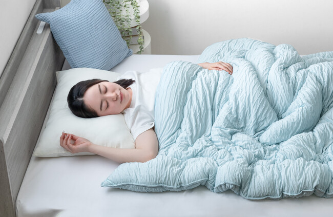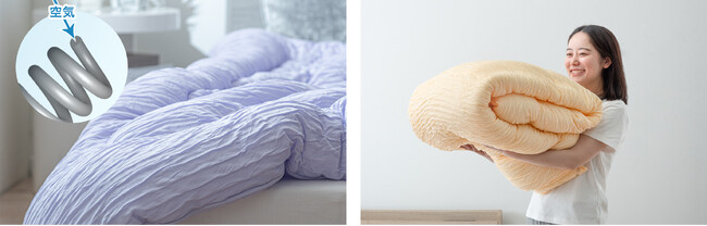 さらに「3Dポリエステルわた」に加えて旭化成が開発した高性能な機能わた「アクアミュー(R)」も併せて使用しているため、蒸し暑い季節の湿気や寝汗でのジメジメを軽減し、さらりと快適にお休みいただけます。