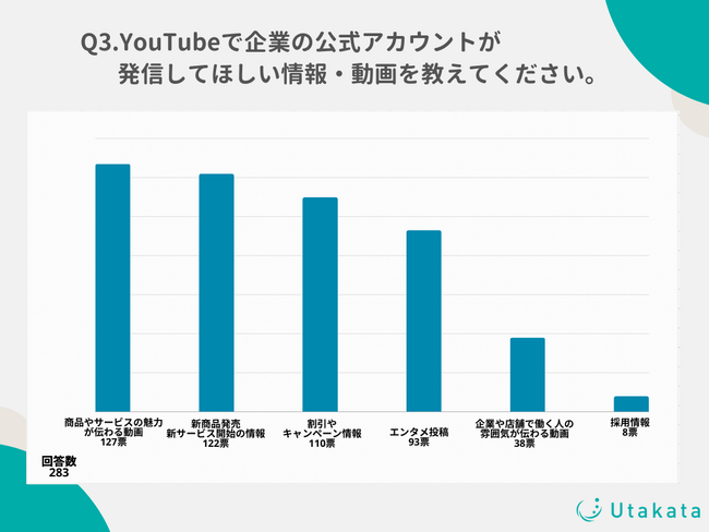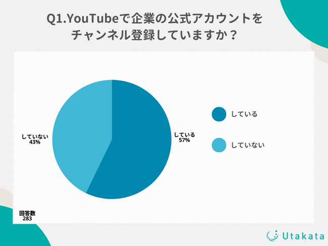 ショート動画SNSの運用やインフルエンサーキャスティングを行う株式会社Utakata(https://utakata.co.jp/)は、10代~50代のYouTube視聴者の男女283名を対象に、「YouTubeの企業アカウント」に関する調査を実施しましたのでお知らせいたします。