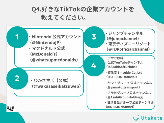 「YouTubeを有効活用しているイメージがある企業アカウントを教えてください。」と質問したところ、「Nintendo」「マクドナルド」が同率10票、「わかさ生活 」が7票、「ジャンプチャンネル」「東京ディズニーリゾート」が同率5票、「アサヒ飲料」、「資生堂」、「ヤマトグループ」、「アサヒグループ」、「日清食品グループ」が同率4票という回答となりました。