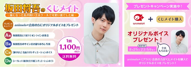 株式会社ドワンゴは、株式会社アニメイトが提供するオンラインくじサービス「くじメイト」にて、声優・坂田将吾のオンラインくじ「坂田将吾のくじメイト特番~猫になった私の飼い主はクールで可愛い彼でした編~」を2024年6月26日(水)~8月25日(日)までの期間限定で販売します。