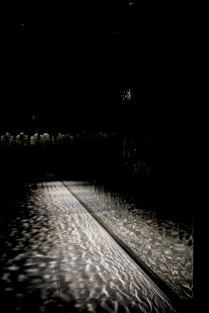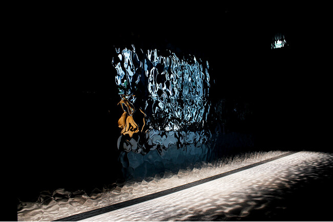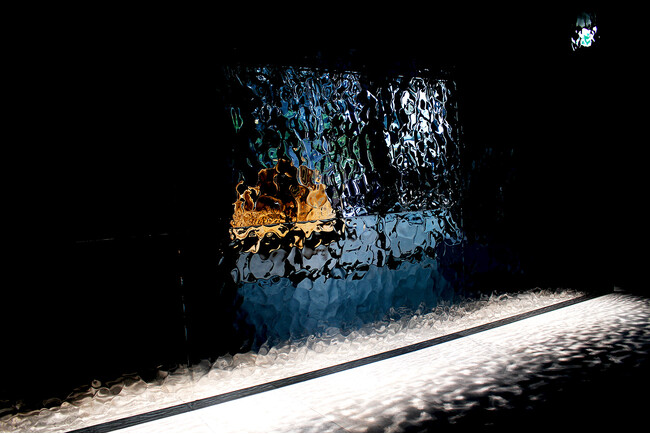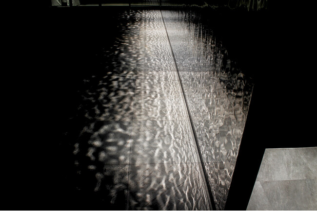 本プロジェクトでは、東洋ステンレス研磨工業の特注仕様「ミステリアスミラー(R)リップルス」が用いられ、通路壁面に三種類のパネルが施されました。これらのパネルは、テクスチャーの変化とともに光の反射が異なり、見る角度によって異なる印象を与えることで、通路を進む度に新たな発見と感動を提供します。特に、光が巧みに計算された角度で反射し、床面タイルに美しく散りばめられた光が投影される様は、訪れる者を非日常的な世界へ誘います。