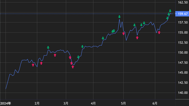 銘柄ごとに、過去のチャートからシグナルが多い日/少ない日をチャート上で矢印を表示しています。