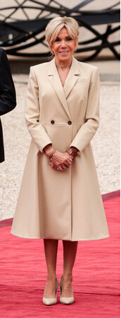 また、ブリジット・マクロン仏大統領夫人は、オリンピック開会式前のエリゼ宮のレセプションにて、ルイ・ヴィトンのカスタムメイドのベージュのカシミアフランネルダブルブレストコートドレスを着用しました。