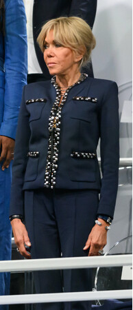 ブリジット・マクロン仏大統領夫人は、ルイ・ヴィトンのカスタムメイドのネイビースキューバジャージーのボクシージャケットと、ブーツカットパンツを着用しました。このツーピースは縁とポケットにシルバーとブラックのダミエ刺繍が施されています。