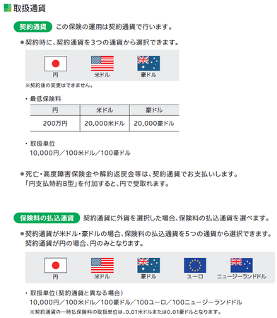 契約通貨が米ドルまたは豪ドルの場合、保険料を多彩な通貨(円、米ドル、豪ドル、ユーロ、ニュージーランドドルの5種類の通貨)から選択してお払い込みいただけますので、既にお持ちの外貨もご活用いただけます。