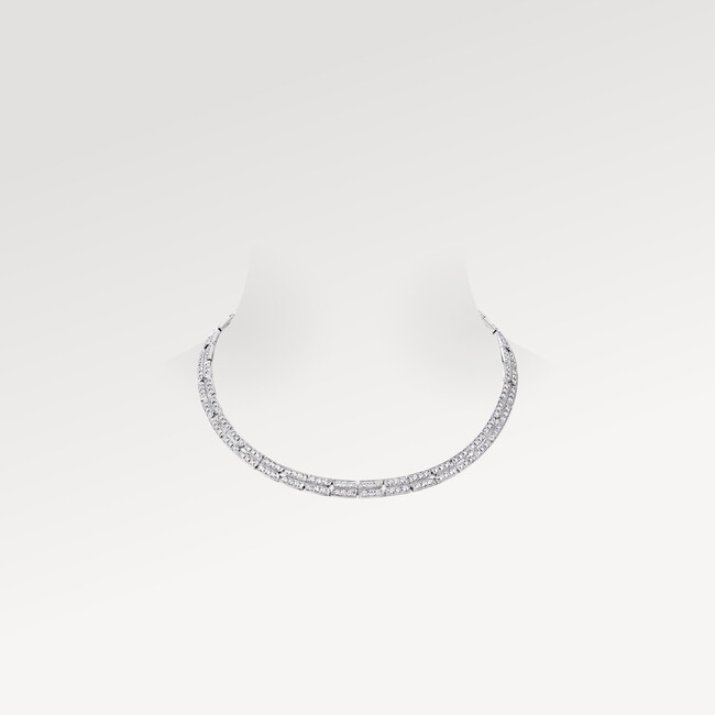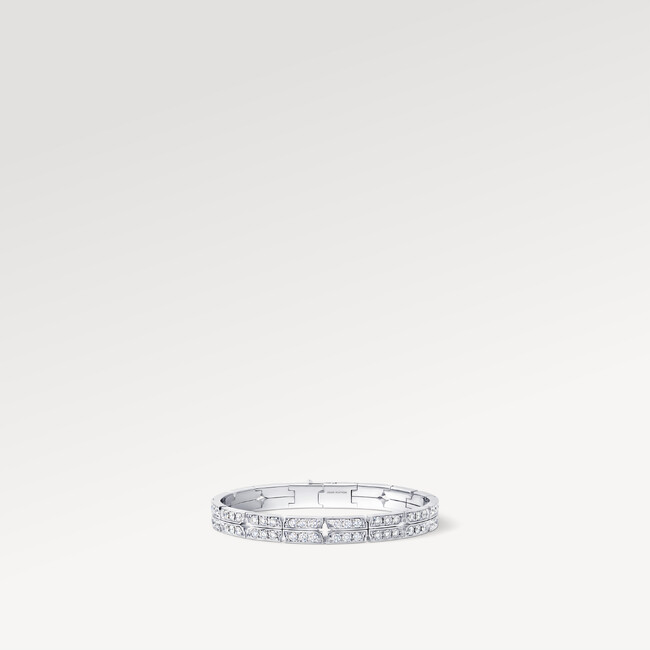 全体が関節式のネックレスは、オープンワーク加工を施したホワイトゴールド仕立て。スターシェイプのモノグラム・フラワーの配列をあしらった光り輝くパヴェダイヤモンドのリンクにより、独自のしなやかさとフィット感を備えています。ネックレスとマッチするブレスレットも同じパターンを再現。