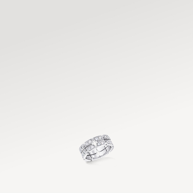 そして今、5つの新しい魅惑的なジュエリーをレパートリーに加えたルイ・ヴィトンの「タンブラー」コレクションと共に物語は続きます。シャープで幾何学的なラインにセットされた、ホワイトゴールドと絡み合うパヴェダイヤモンドの配列のテーマは活気に満ち、プレシャスなスターシェイプのモノグラム・フラワーがオープン加工仕上げで生き生きと表現されています。アイコニックでタイムレス、本質的にユニセックスのジュエリーは単体で身に着けることも、さまざまな解釈のセルフスタイリングで楽しむこともできます。