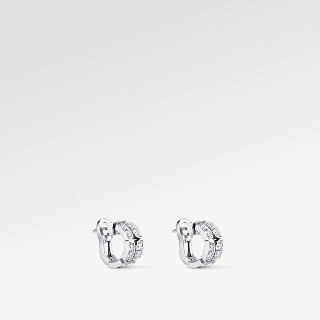 また、洗練されたオープンワーク加工のモノグラム・フラワーをあしらった総ダイヤモンドのパヴェリングは単体で、またはよりインパクトのある重ね着けもでき、2つのフープピアスが新作コレクションのコーディネートを完成させます。スターシェイプが垣間見える1組の繊細なフープピアスは、フェミニンとマスキュリン、両方の雰囲気を併せ持ちます。最後に、片耳用のイヤーカフはそれ自体で華やかなステートメントピースとして機能すると共に、フープピアスに組み合わせても見事にマッチ。