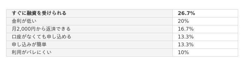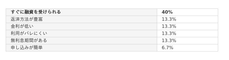 - カードローン会社を選んだポイントや良かった点として、「審査・融資スピードの速さ」「金利の低さ」が上位を占めている