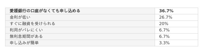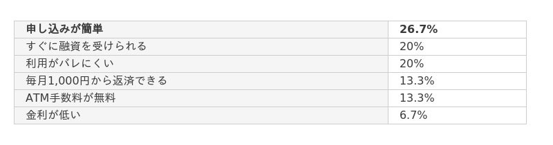 - 「申し込みしやすさ」に関しては、ほとんどの金融機関でネット完結できるものが多いため、そこまで重視されていないと考えられる