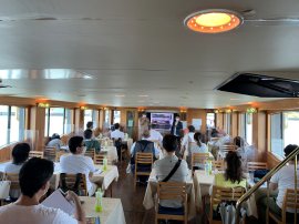 講座は、モニターやマイク設備がある船内で座学の実施と屋外空間である船上デッキに上がり、実際に淀川を見ながら現地調査を行う、2部構成にて実施します。