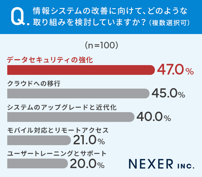 「データセキュリティの強化」が47%、「クラウドへの移行」が45%、そして「システムのアップグレードと近代化」が40%と続きました。