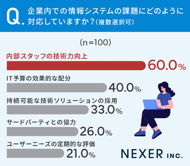 60%と半数以上の方が「内部スタッフの技術力向上」と回答しており、他と大きな差をつけています。