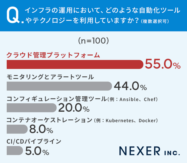 続いてインフラの運用において、どのような自動化ツールやテクノロジーを利用しているのかも聞いてみました。