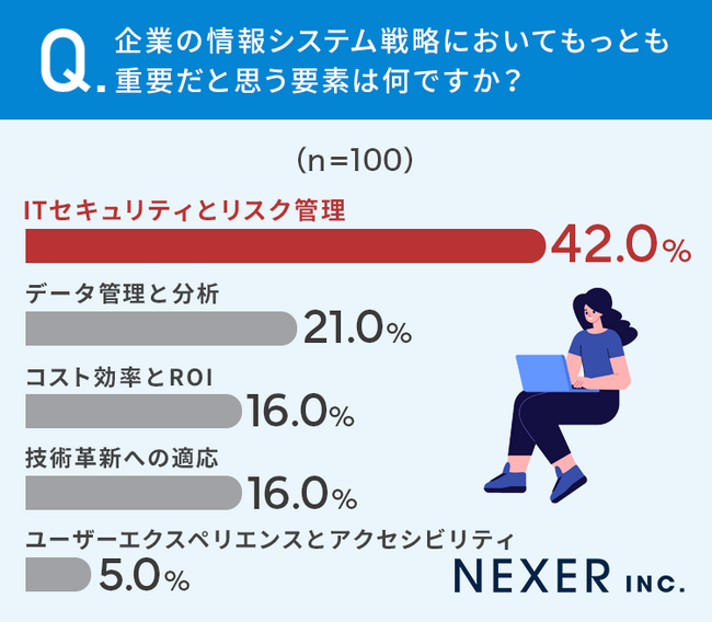 さらに企業の情報システム戦略においてもっとも重要だと思う要素として、「ITセキュリティとリスク管理」と回答したのが42%という結果が出ました。