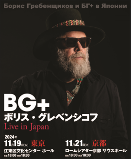 2024年11月に、ソ連時代から常に時代の象徴となってきた伝説のバンド「アクワリウム」のリーダーで、BG(БГ)の愛称で知られるボリス・グレベンシコフ率いる「BG+」がフルメンバーで初来日。グレベンシコフは2022年2月のロシア軍によるウクライナ侵攻に反対し、ロシア国内での活動を停止。アクワリウムのメンバー7人で新バンド「BG+」を立ち上げ、ワールドツアーを続けている。この秋に東京と京都で開かれるコンサートでは、BG+の新曲やアクワリウムの名曲の数々が演奏される。