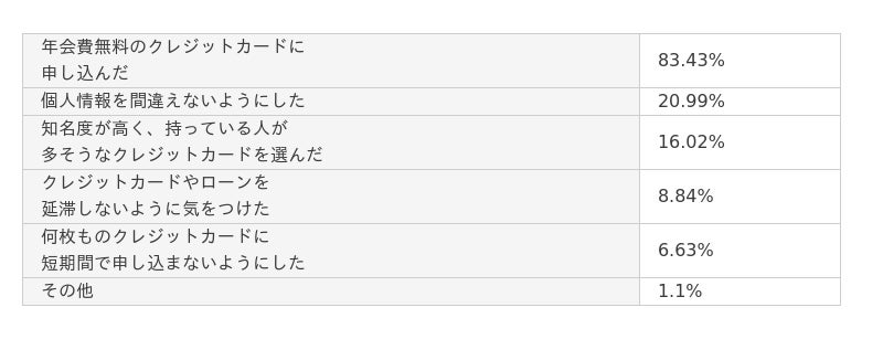 - 無職の方がクレジットカードを作る際に気を付けたこととして「年会費無料のクレジットカードに申し込んだ」と回答した人が83.43%。