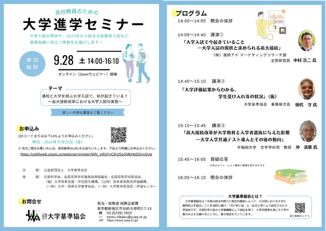 公益財団法人大学基準協会(所在地:東京都新宿区、会長:高橋 裕子)は、2024年9月28日(土)に、「大学進学セミナー」を開催いたします(オンライン・Zoomウェビナー形式)。講演者として(株)進研アド マーケティングリサーチ部主席研究員の中村浩二氏、本協会事務局次長の田代守氏、早稲田大学文学学術院教授の沖清豪氏を迎え、高大接続の観点から大学入試の実態に迫るとともに、認証評価結果を用いた情報収集、高大接続改革による入試の変化等についてお話いただきます。