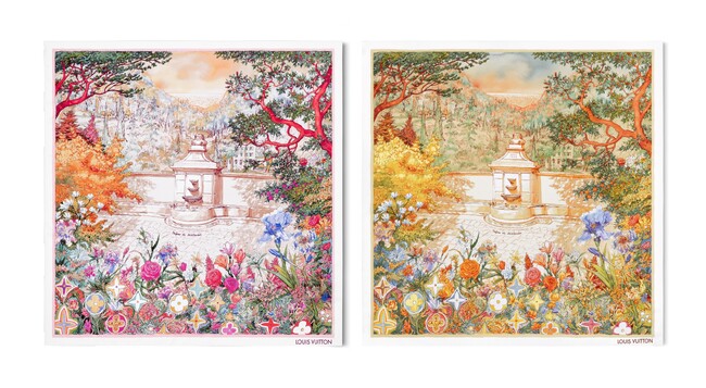 アーティストのロレンツォ・マトッティは色鉛筆とパステルを使用し、『Fires』や『Murmur』といった有名なコミックブックや、『New Yorker』や『Süddeutsche Zeitung 』に掲載されたイラストで、夢のような世界観を生み出しています。ルイ・ヴィトンのカレ「Iris Spring」は、メゾンのアニエールのアトリエ内にある歴史的なヴィトン家の邸宅の美しいアールヌーヴォー様式のステンドグラスに描かれた花へのオマージュ。多彩な木々や滝が完璧なフレームとなり、アイリスの流れるようなフォルムが、万華鏡のように素晴らしいファンタジーの中心的存在となっています。