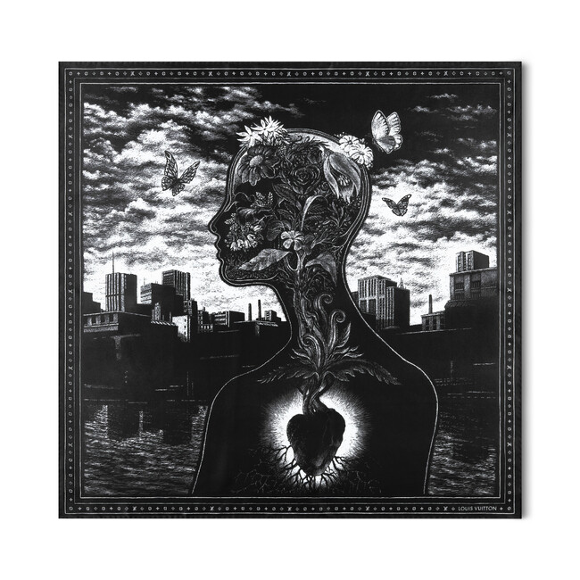 スイス人アーティストのトーマス・オットは、『The Number 73304-23-4153-6-96-8』といったダークで印象的なグラフィックノベルの中で、スクラッチボードを使用して完全な白黒の世界を作り上げ、純粋なビジュアルストーリーを展開。ルイ・ヴィトンのカレ「Urban Flowers」では、この緻密な作業を要するアーティスティックな技法を採用しました。繊細かつシュールな明暗法でイメージを描き、花を人間の抑えきれない精神のシンボルへと変容させ、都市に住む私たちの生活を一変させる自然の力を表現しています。
