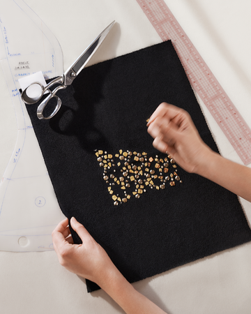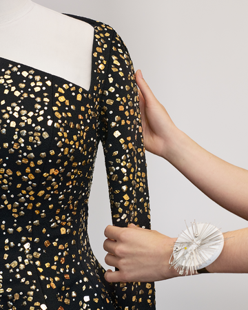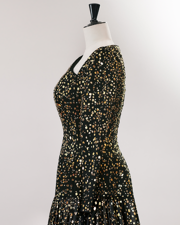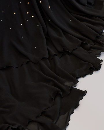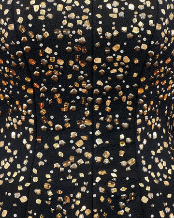 アデルが着用したドレスは、ゴールド、シルバー、コッパーのスパンコールで刺繍が施されたブラックのアシンメトリーが特徴的です。ブラックのクレープシルクジョーゼットの軽やかなレイヤーがフルスカートに流れ込む美しいデザインで、メゾンのサヴォアフェールの技術が随所に施されています。