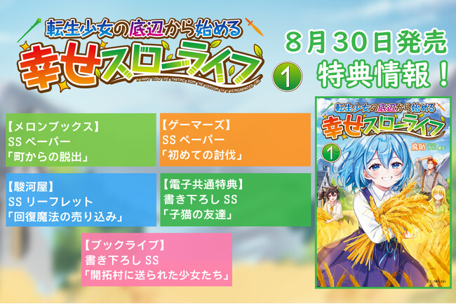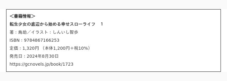 コミックライドにてコミカライズも決定!GCノベルズ『転生少女の底辺から始める幸せスローライフ 1』8月30日発売!