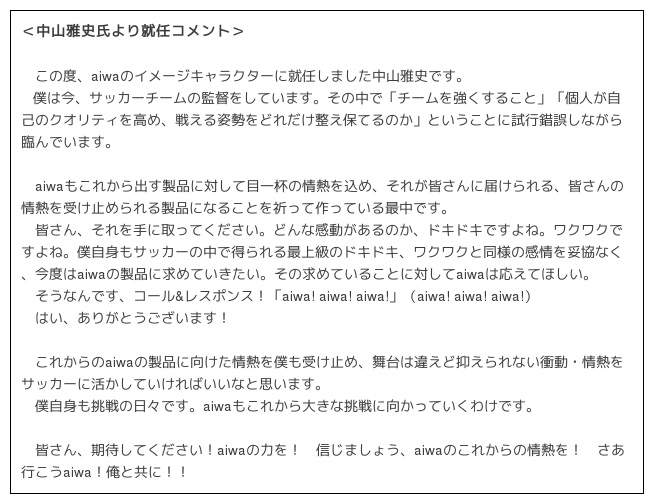 中山雅史氏は、日本代表選手としての豊富な経験と実績を持ち、現在もプロサッカーチームで監督を務められています。“プロフェッショナルの確かな決定力”をもってサッカー界を牽引してきた同氏のイメージキャラクター起用により、消費者からの需要に応える製品を常に開発してきたaiwaが、今後も“果敢に挑戦する姿勢”を示してまいります。また、ミドル世代を中心とした親しみやすさや、パワフルで勢いのあるパーソナリティーがブランドのさらなる飛躍を後押ししてくれるものと考え、この度イメージキャラクターとして就任いただきました。