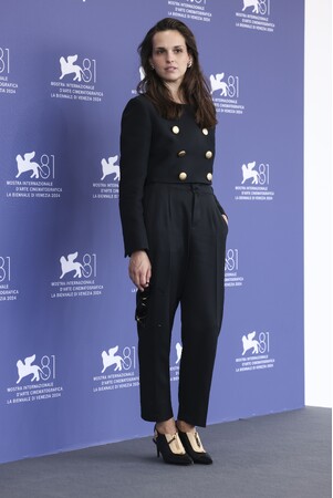 また、「Vermiglio(原題)」のフォトコールでは、ブラックのダブルブレストジャケット、ハイウエストパンツにバイカラーのレザースリングバックパンプスを合わせました。