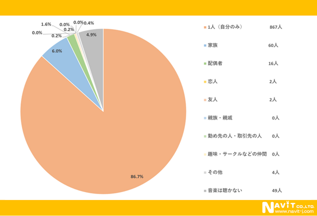 音楽を一緒に聞く相手は、「1人(自分のみ)」が最多