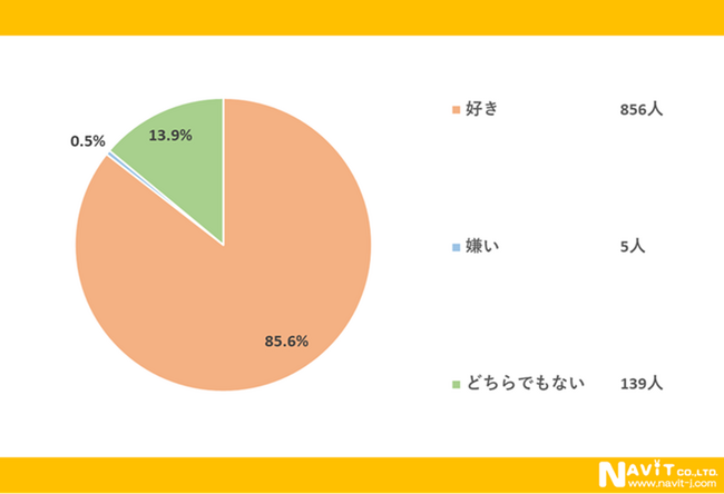 「あなたは音楽が好きですか?」という質問については、「好き」が85.6%、「嫌い」が0.5%、「どちらでもない」が13.9%と、8割以上の人は、音楽が好きだと回答していました。