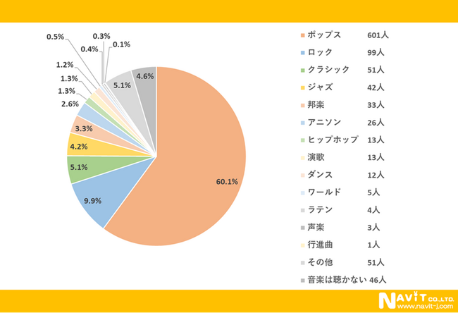 「1番好きな音楽のジャンルは何ですか?」という質問については、「ポップス」が60.1%、「ロック」が9.9%、「クラシック」が5.1%という順になりました。