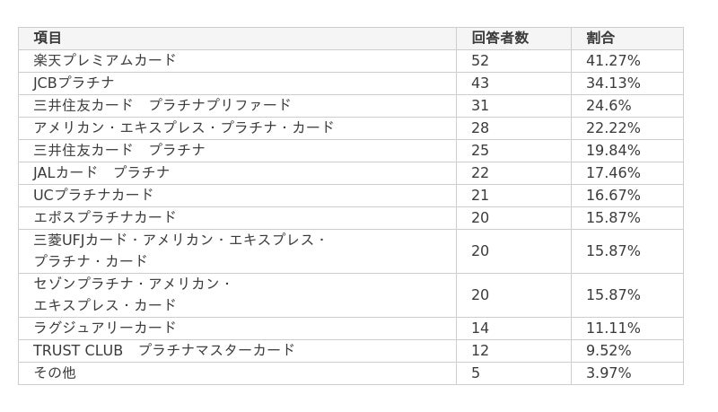 - プラチナカードを持っている人の中で41.27%が、「楽天プレミアムカード」を所有している。