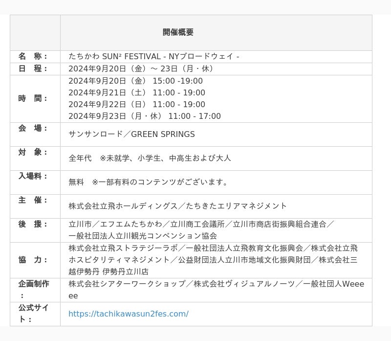『たちかわ SUN² FESTIVAL -NYブロードウェイ-』 に関するお問合せ