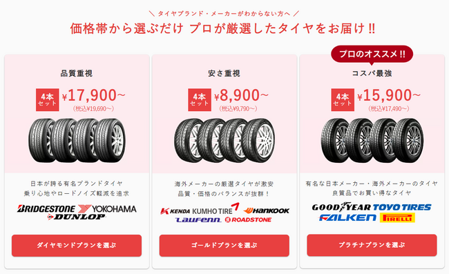 メーカー・グレード・ブランド・サイズによって価格が分かりにくいタイヤを3つのプライスにパッケージ化しているため、選びやすさと低価格を実現。