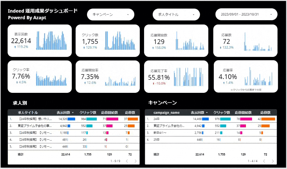 特定求人サイトへの配信特化機能を利用いただくお客様は、運用成果を日次でモニタリングできるダッシュボードの提供を開始いたします。お客様ご自身でも、サイト別、求人別、キャンペーン別、特定期間の結果を探索することが可能になります。