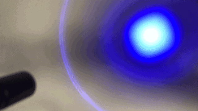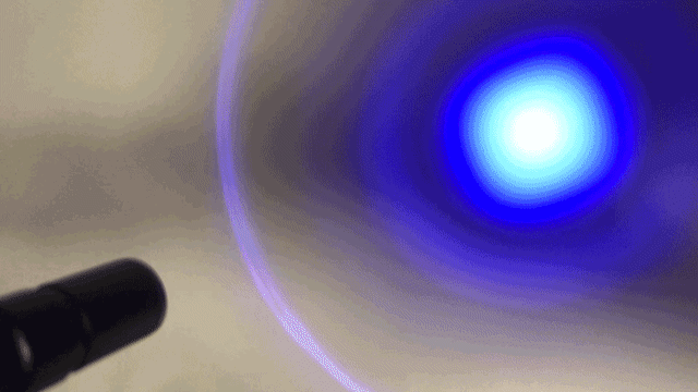 ※405nm-410nmのブルーライト照射機を使用、iphone8のカメラで撮影。カメラで撮影しているため、この映像では人間の目で見るよりもブルーライトが鮮明に見えています。