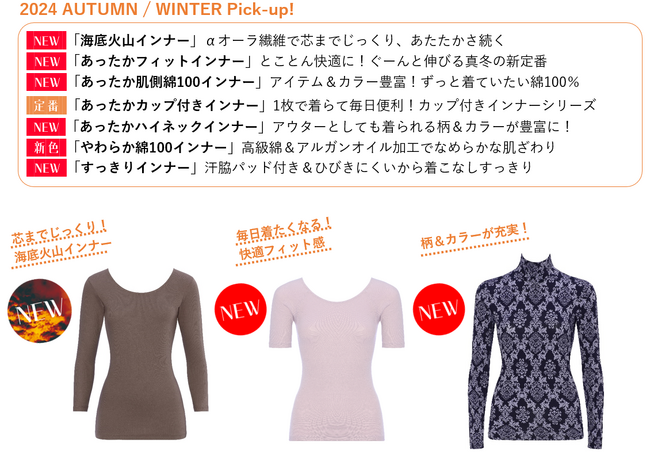 今シーズンは、新シリーズが豊富に登場します。あたたかさレベル5「海底火山インナー」は、マグマのパワーでしっかり芯からあたたまる、岩盤浴並みのあたたかさ。薄手ファッションやアウトドアレジャーにおすすめです。あたたかさレベル4「あったかフィットインナー」は、ぐーんと伸びてふんわりフィットする、ストレスフリーな快適さにこだわりました。そしてあたたかさレベル3「あったかハイネックインナー」は、暗くなりがちな秋冬ファッションが華やかになる、アウターとしても着られる新アイテム。トレンド感のある柄&カラーにご注目ください!