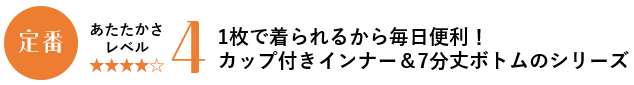 ふんわりソフトな肌ざわりと、ラクな着けごこち。1枚で着られる便利なカップ付きインナー2型と7分丈ボトムのシリーズです。トップは背中部分が二重仕立てになっているので、あたたかいだけでなく、カップのフィット感も安定(ボトムは腰部分が二重仕立て)。身生地には吸湿発熱性にすぐれた素材を使用。吸放湿性もあるため、ムレを軽減します。