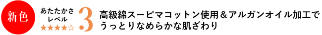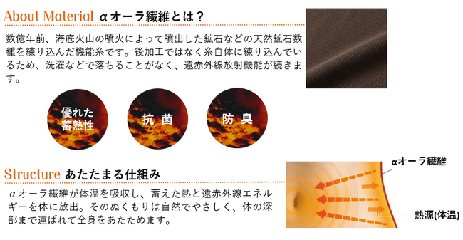 海底火山から生まれたオーラストーン(TM)を含む天然鉱石数種を練り込んだ機能糸で、体の芯からじんわり、しっかりあたたかさが続くシリーズです。天然鉱石の持つ特性で、抗菌・防臭性があります。編地はスムース生地で、肌側が微起毛になっており、やさしい肌ざわりと保湿性を高めました。