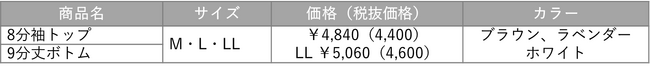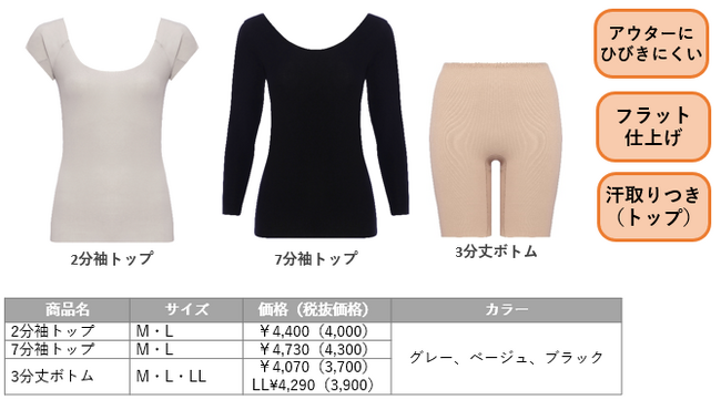 フィットしたアウターの下でもひびきにくいシリーズです。生地端が縫製なしのフラット仕様なので段差ができにくく、肌あたりも快適。さらりとした風合いの速乾性のある綿混70%素材を使用しています。トップ2型の脇部分には汗臭対策できる汗取りパッドを付けました。スリムなパンツ&スカートもすっきりの3分丈ボトムはマチ付きで1枚ばきOKです。
