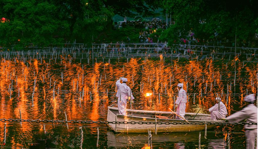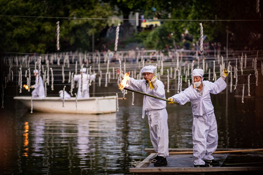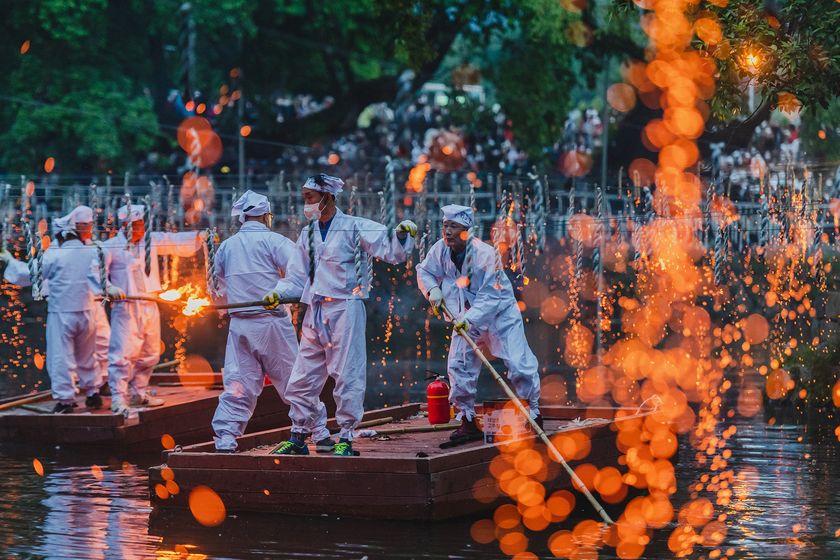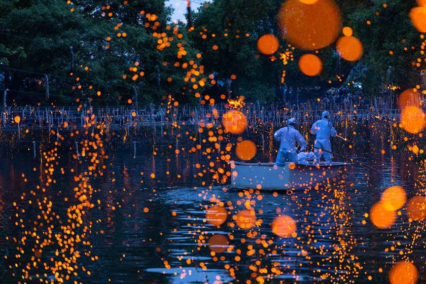 いかだに乗った落火ノリ保全会会員による点火