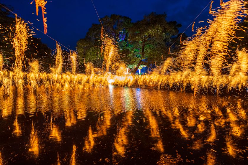 1000年を巡る輪廻転生のラブロマンスを描いた韓国ドラマ『生まれ変わってもよろしく』でも登場した、幻想的な世界が楽しめる「咸安落火ノリ」。炭と韓紙(韓国伝統製法の紙) をねじって縄状に編んだ「落火棒」数千本をひもにぶら下げて火をつける、民俗行事の花火のお祭りで、慶尚南道の無形文化財第33号にも指定されています。毎年釈迦誕生日(旧暦4月8日)に行われており、祝賀公演、祭礼行事、落火棒点火、招待歌手公演などさまざまな見どころあるのが魅力です。