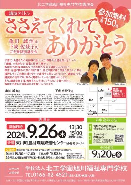 学校法人北工学園 旭川福祉専門学校は、開校50周年を記念し、今年度は3つの特別講演会を予定しております。第1弾の特別講演会について、子育て・介護などの実体験に基づいて、保育や介護を担う方々への「感謝」の気持ちを、音楽の仕事に携わる亀田ご夫妻にご講演いだだきます。