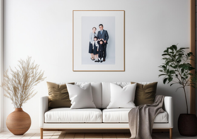 お客さまの思い出の場所で撮影した貴重な一枚をポスターサイズ(A2サイズ)に額装しお渡しします。