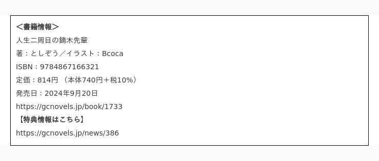 マイクロマガジン社(東京都中央区)は、GCN文庫『人生二周目の鏑木先輩』(著:としぞう/イラスト:Bcoca)を9月20日に発売いたします。