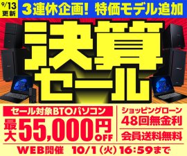 パソコン工房WEBサイト、セール対象BTOパソコンが最大55,000円OFFの『決算セール』開催中