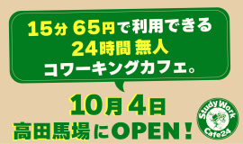 "15分65円"で利用できる24時間無人コワーキングカフェ。「StudyWork Cafe24 高田馬場店」を10月4日(金)に新規オープン!