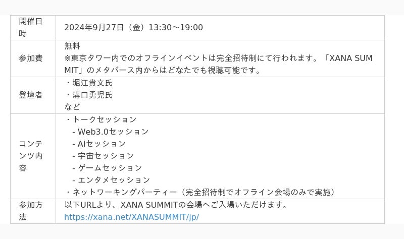 コラボイベントは、2024年9月27日(金)13:30~19:00に東京タワー内で開催し、イベントの様子を「XANA SUMMIT」のメタバース内で生中継いたします。「XANA SUMMIT」のメタバース内からどなたでも視聴可能です。宇宙事業、金融、エンタメなど、様々な業界をリードする専門家をパネリストとして迎え、メタバースとWeb3の最新動向や活用事例についてのトークセッションを行い、メタバースとWeb3の可能性を探求します。